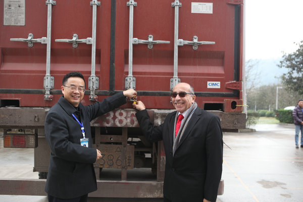 海扶醫療總經理蔣鋼與肯尼亞合作伙伴一起為集裝箱車插上了鉛封,貨車載著全體海扶人的心愿、祝福與承諾啟動,駛向一片新的大地