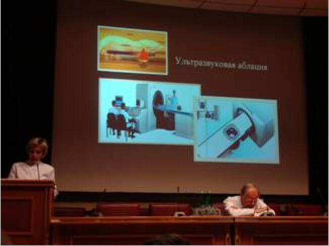 6月4日上午,李博士應邀參加在莫斯科中央銀行醫院召開的HIFU技術研討會。此次會議匯聚了來自俄羅斯及烏克蘭等地12家醫院的院長、超聲科、耳鼻喉科和婦科主任。中央銀行醫院Alla教授、Flora教授和Yuri主任分別就應用HIFU技術治療腫瘤、過敏性鼻炎及婦科疾病進行了精彩演講,受邀的來賓對HIFU技術表示了強烈的興趣。會后各科專家主任分別到各科觀摩了HIFU治療及利用離體牛肝進行了聚焦超聲治療的實驗演示,婦科的Yuri主任演示了兩例宮頸炎的聚焦超聲治療并回答了觀摩專家提出的各種問題,回答令專家非常滿意。兩例宮頸炎治療也很成功,其中一例患者僅治療1分37秒鐘就看見明顯的組織學變化,贏得了大家對HIFU技術的喝彩。